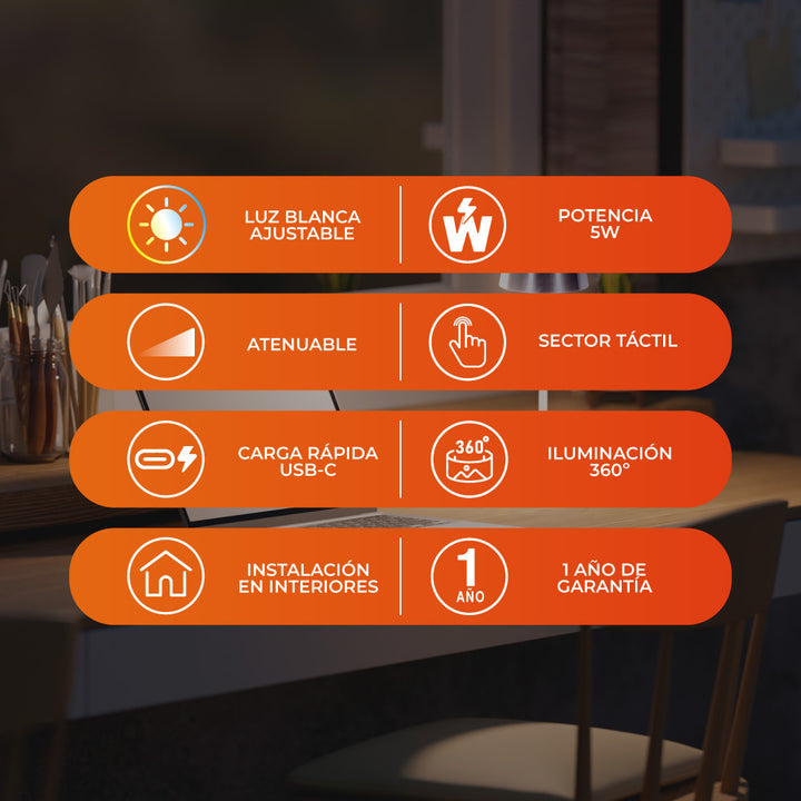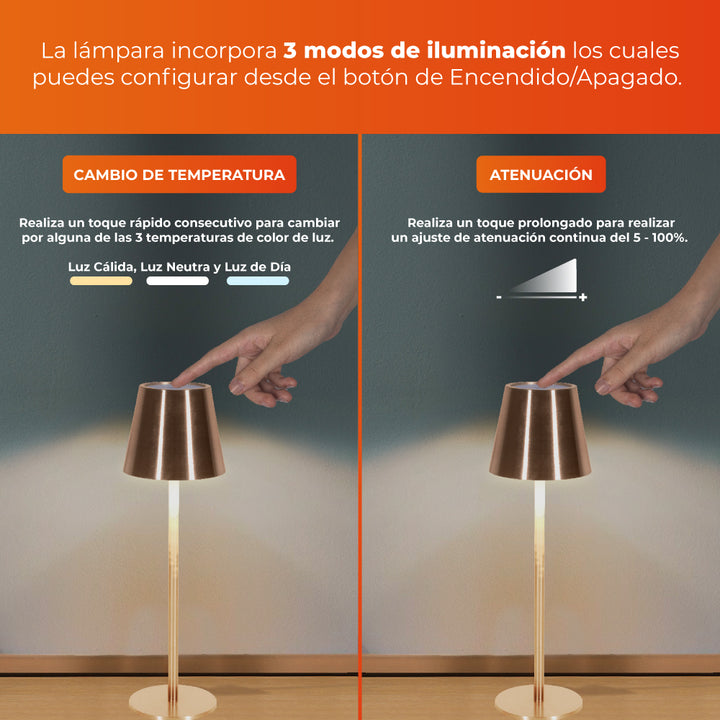 IMAI II es una lámpara de mesa diseñada para adaptarse a cualquier espacio interior que requiera luz funcional y ambiente acogedor. Fabricada en acero y policarbonato, combina diseño contemporáneo con tecnología táctil. Su iluminación LED integrada permite elegir entre tres temperaturas de color y ajustar la intensidad con un solo toque. Gracias a su batería recargable y formato sin cables, puede colocarse libremente sobre burós, escritorios, mesas auxiliares o recepciones, ofreciendo luz homogénea en 360°.