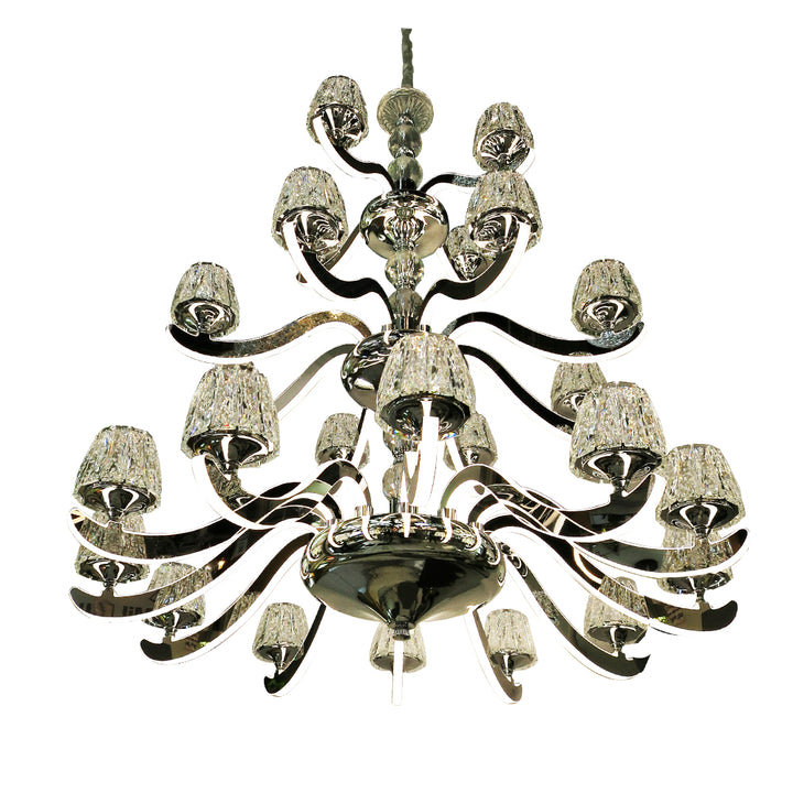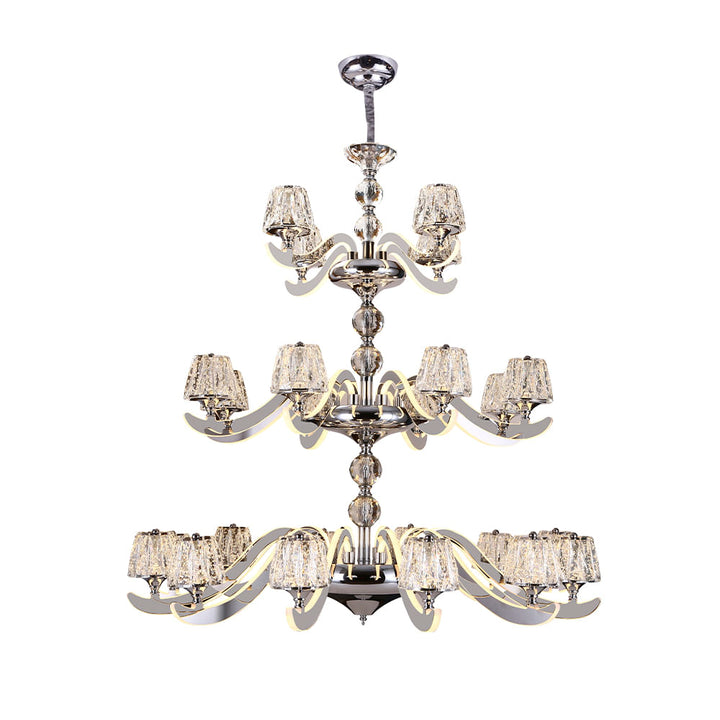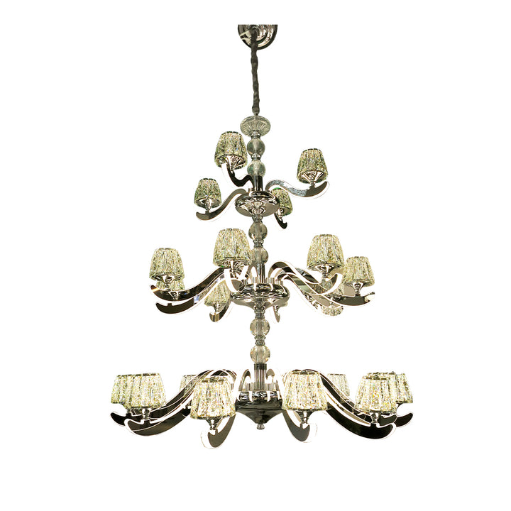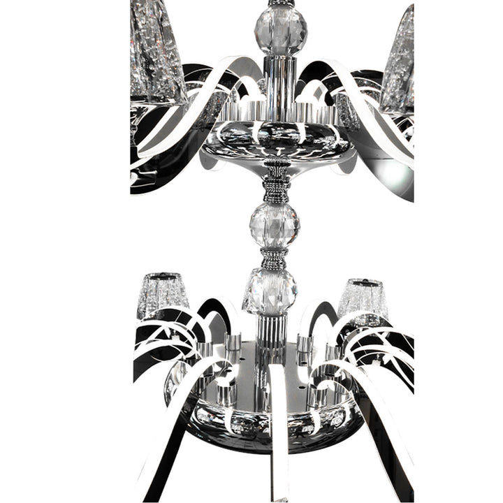 Ideal para hogares, hoteles, salones de eventos, santuarios y espacios comerciales, este candil destaca por su estructura en metal gris satinado y su impresionante juego de cristales facetados, que reflejan la luz de manera deslumbrante.
