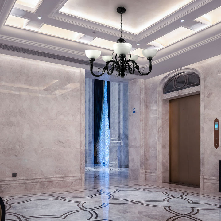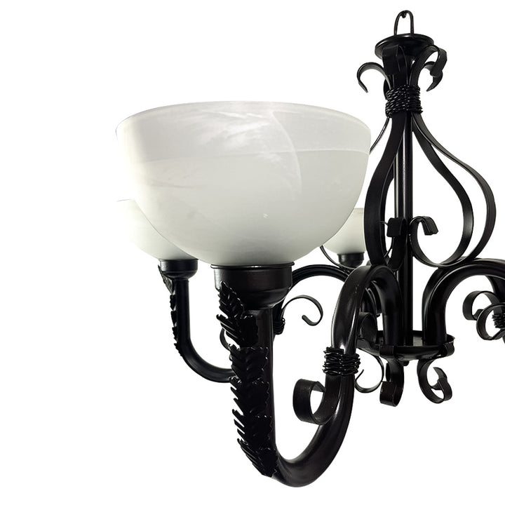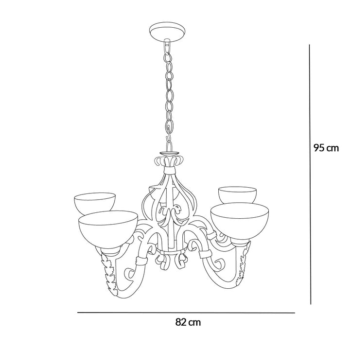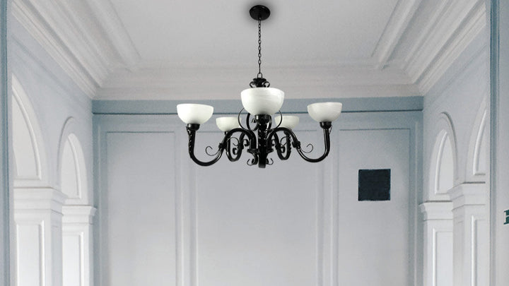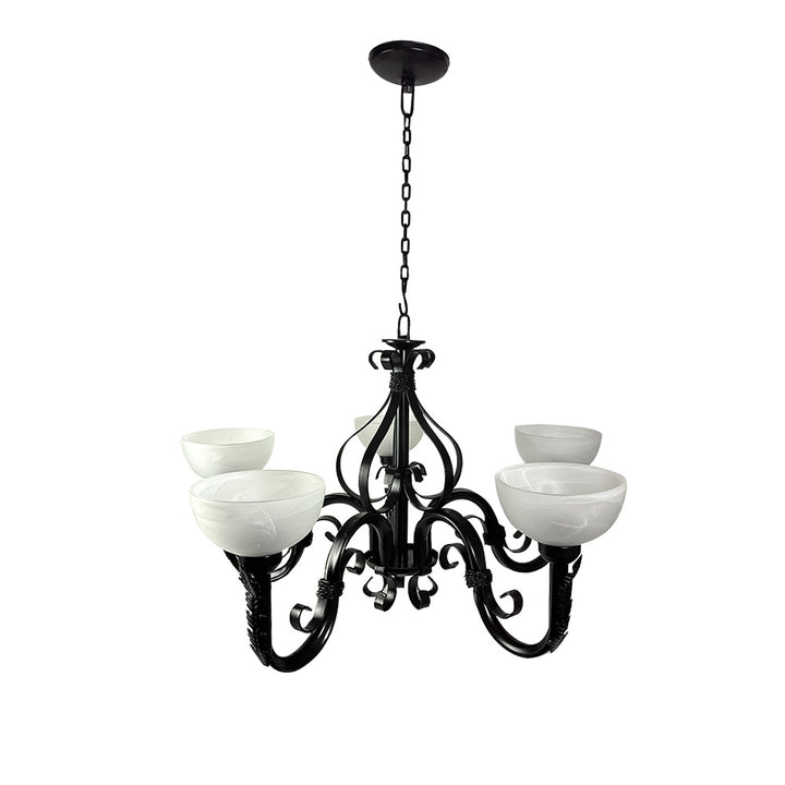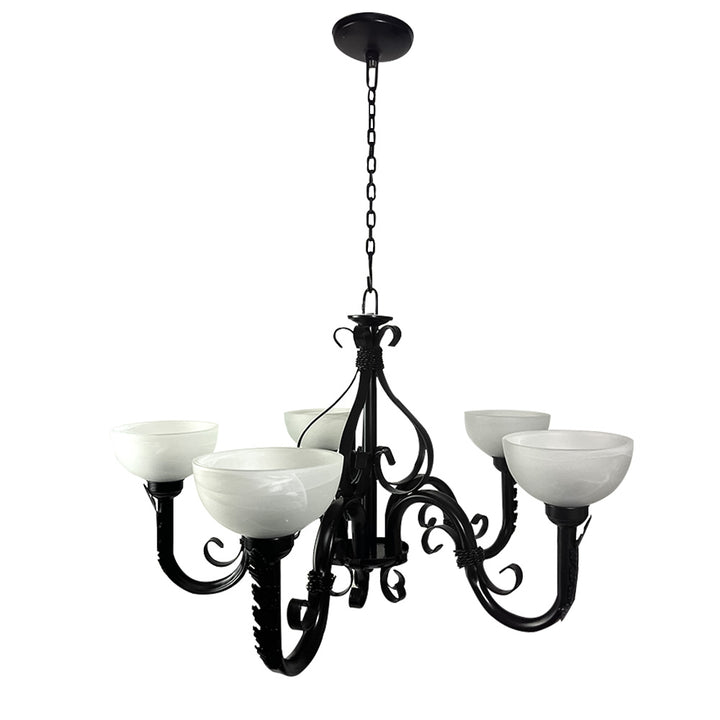 Candil Hidalgo 005, 5 x 60W. Es una solución de iluminación decorativa, brinda un ambiente cálido cuenta con pantallas de vidrio marmoleado para un estilo clásico.