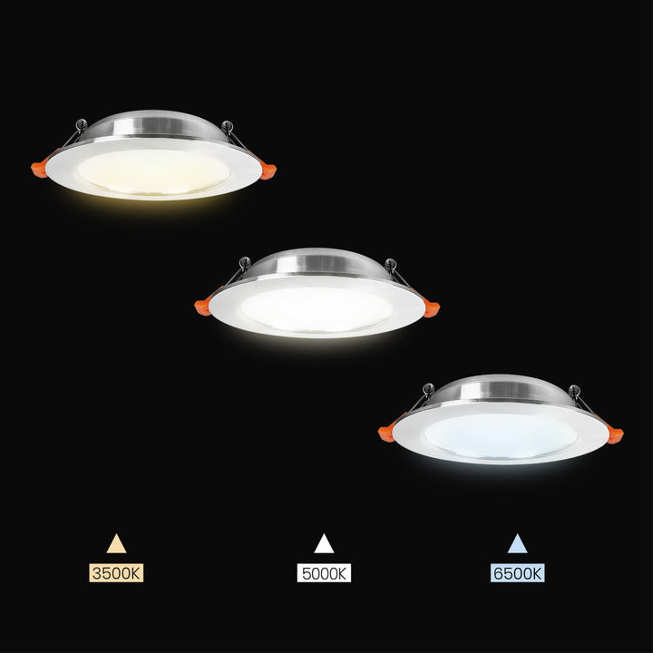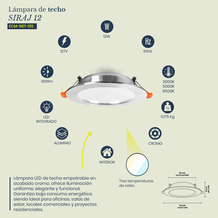 La lámpara empotrable SIRAJ 12 en acabado cromo combina elegancia y funcionalidad en un diseño discreto. Con LED integrado de 12W y tres temperaturas de color (3500K, 5000K y 6500K), ofrece iluminación uniforme, moderna y eficiente para interiores residenciales o comerciales.