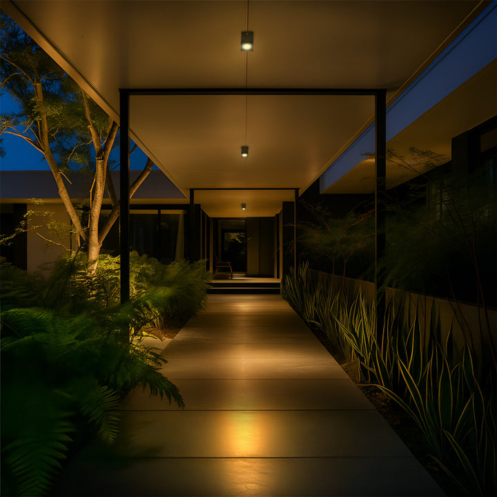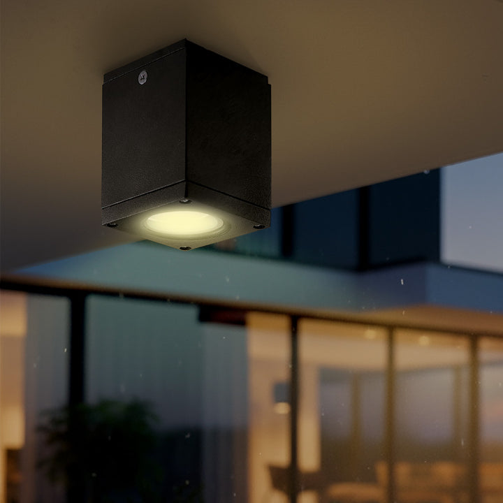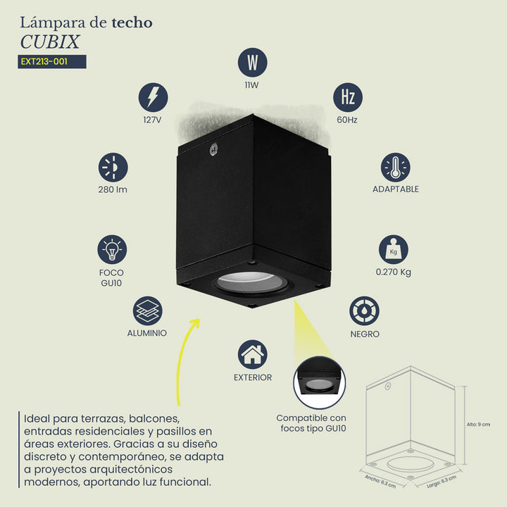 La lámpara de techo exterior CUBIX está fabricada en aluminio con acabado negro mate, destacando por su diseño geométrico moderno y compacto. Su estilo minimalista aporta elegancia y seguridad a cualquier espacio exterior, ofreciendo una iluminación precisa y decorativa.