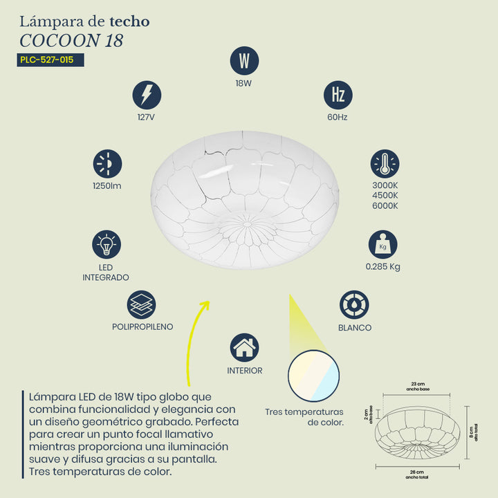 La lámpara de plafón LED COCOON 015 presenta un diseño tipo globo que combina elegancia y funcionalidad con su pantalla de polipropileno blanco de acabado brillante y grabado geométrico. Su tecnología LED integrado de 18W proporciona una iluminación suave y difusa , perfecta para crear un punto focal llamativo en interiores modernos.