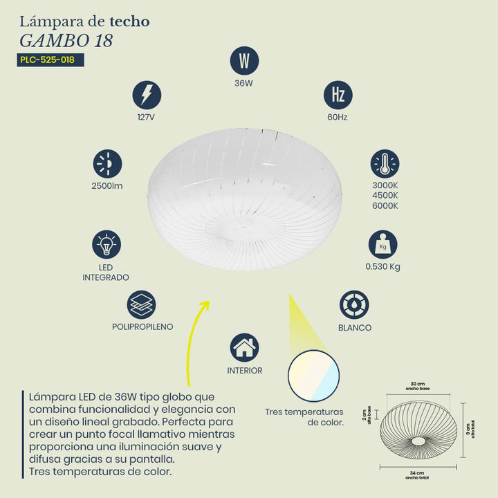 La lámpara de plafón GAMBO 018 combina elegancia y potencia luminosa en un formato tipo globo. Su patrón lineal grabado aporta sofisticación visual, mientras que su pantalla difusora ofrece una luz suave y envolvente, perfecta para interiores amplios.