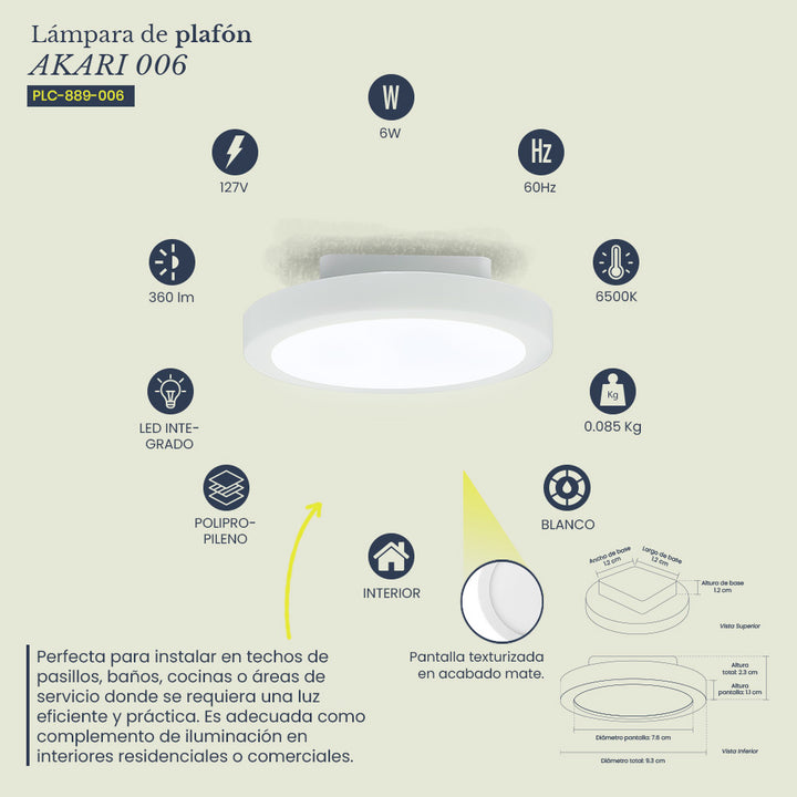 La lámpara de techo AKARI 006 combina diseño minimalista y funcionalidad en un formato compacto de solo 9.5 cm de diámetro. Con LED integrado de 6W en luz fría 6500K, brinda iluminación clara y uniforme para realzar espacios modernos.