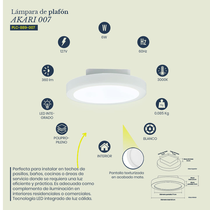 La lámpara de techo AKARI 007 Blanca combina diseño compacto y eficiencia en un formato minimalista de 9.3 cm. Con LED integrado de 6W en luz cálida de 3000K, ofrece iluminación uniforme y confortable, ideal para interiores modernos y funcionales.