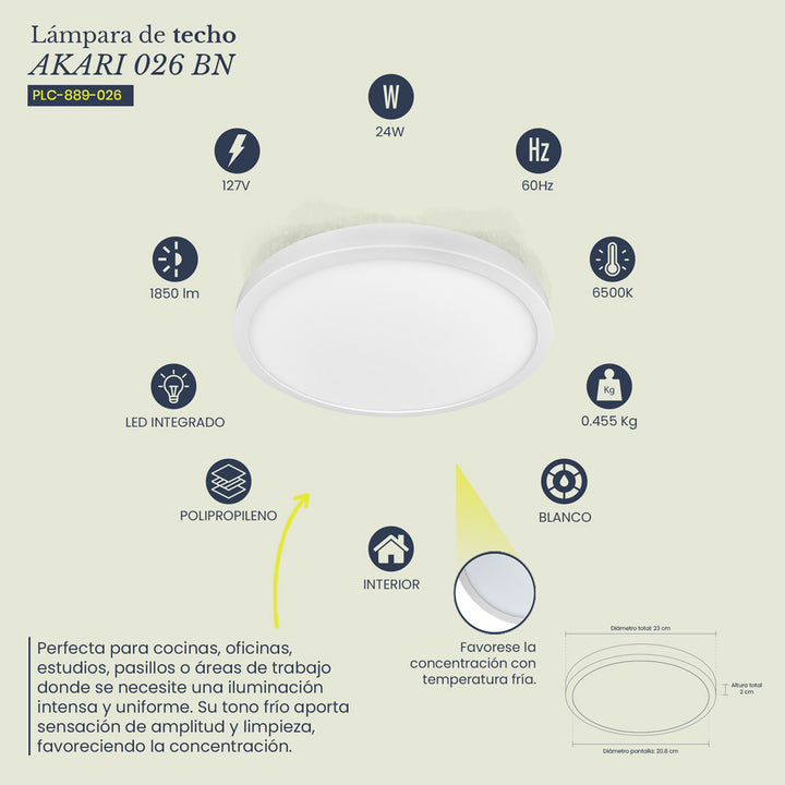 La lámpara de techo AKARI 026 combina diseño moderno y funcionalidad con un acabado blanco mate que se adapta fácilmente a espacios contemporáneos. Con su luz fría de 6500K y potencia de 24W, ofrece una iluminación clara y brillante que realza la visibilidad y aporta un estilo limpio y minimalista.