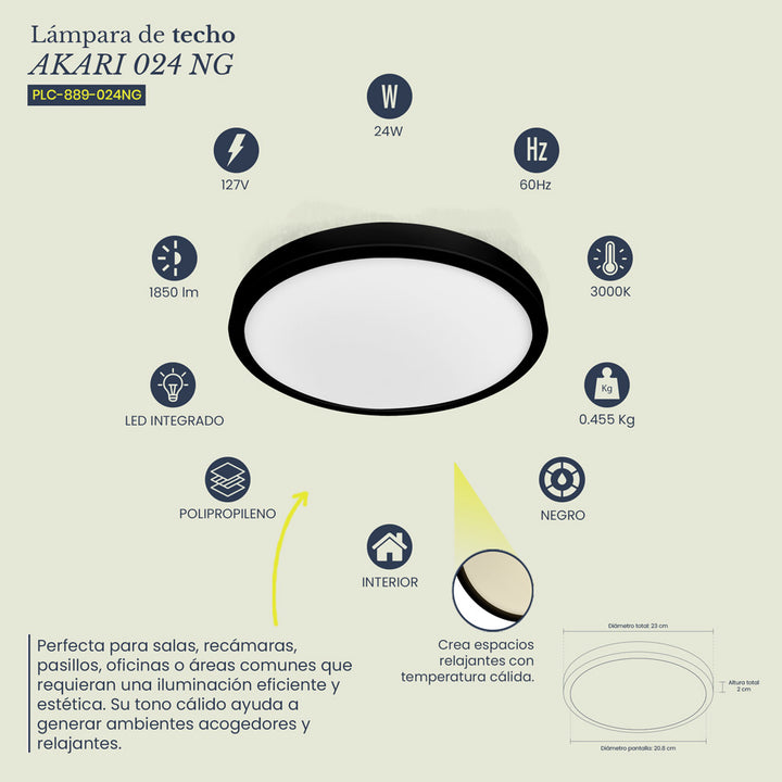 La lámpara de techo AKARI 024 Negra combina elegancia y practicidad en un diseño moderno y delgado. Con LED integrado de 24W en luz cálida de 3000K, ofrece una iluminación suave y eficiente, mientras su acabado negro mate aporta un toque contemporáneo ideal para interiores modernos o industriales.