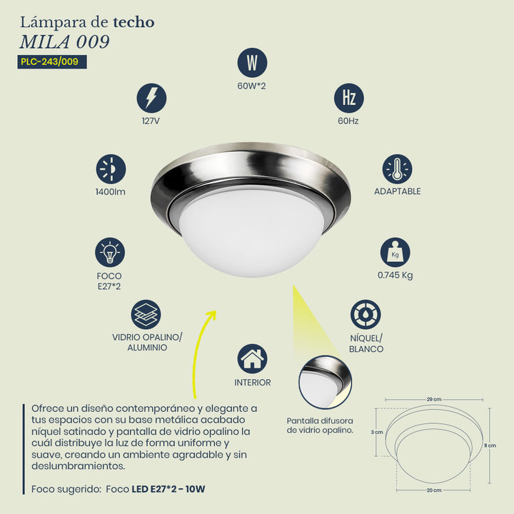 La lámpara de plafón MILA 009 combina elegancia y funcionalidad en un diseño contemporáneo. Su base metálica en acabado níquel satinado y pantalla de vidrio opalino permiten una difusión uniforme de la luz, creando ambientes cálidos y sin deslumbramientos. Su compatibilidad con focos de base E27 brinda flexibilidad para elegir la temperatura y potencia de iluminación deseada.