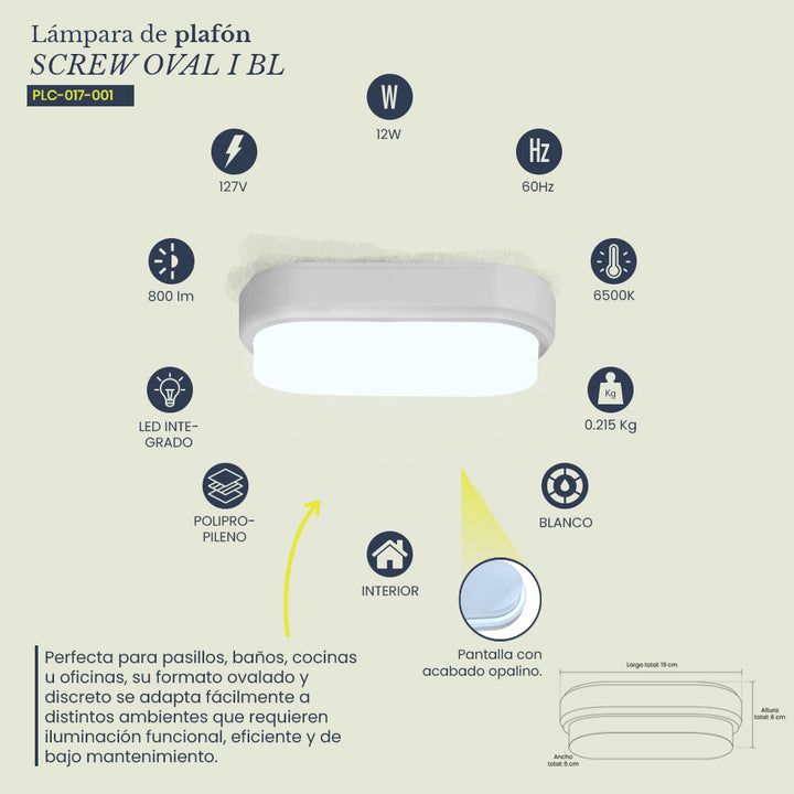 La lámpara de plafón SCREW OVAL I Blanca ofrece un diseño compacto y moderno en acabado mate/opalino. Con tecnología LED integrada de 12W, proporciona luz fría de 6500K, logrando una iluminación uniforme, eficiente y funcional para interiores.