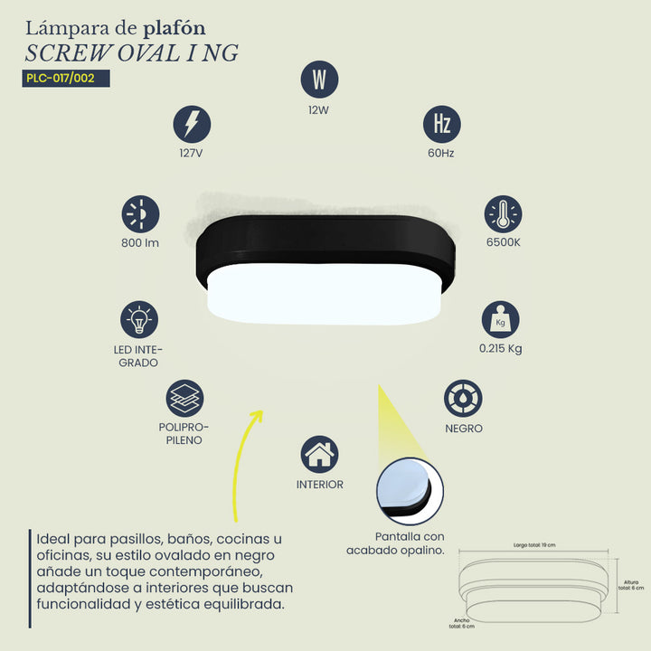La lámpara de plafón SCREW OVAL I Negra combina un diseño moderno y compacto con eficiencia energética. Fabricada en polipropileno, ofrece iluminación uniforme en luz fría de 6500K, ideal para interiores que buscan funcionalidad y estilo contemporáneo.
