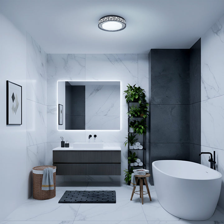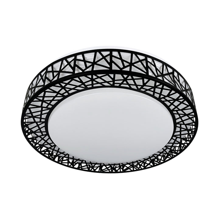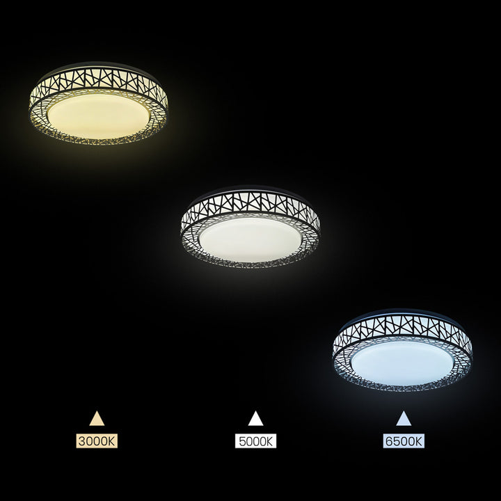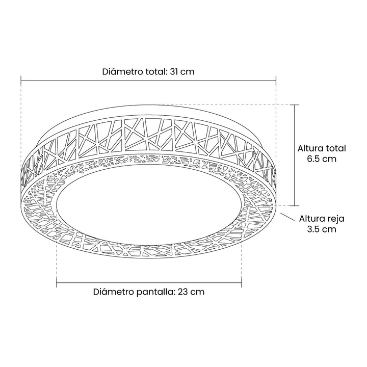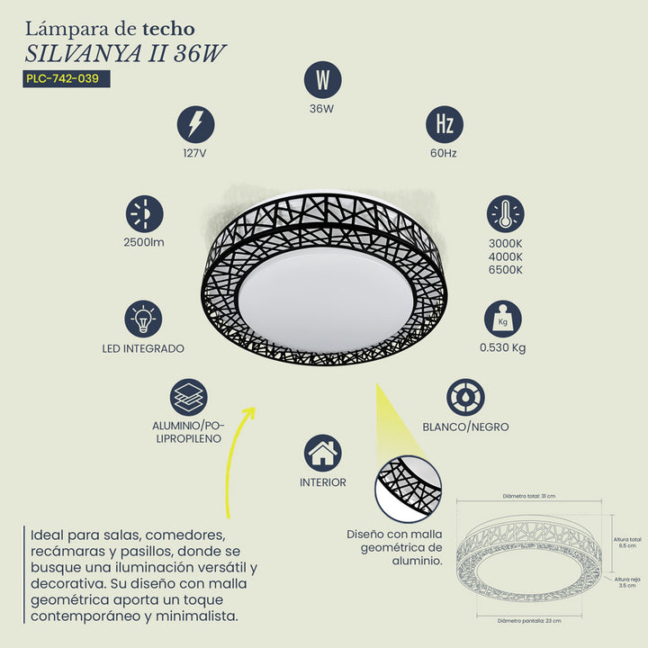 La lámpara de techo SILVANYA II ofrece un diseño moderno con cuerpo de aluminio y malla decorativa, complementado por un difusor de polipropileno opalino que proyecta una luz suave y uniforme. Su sistema LED integrado de 36W con tres temperaturas de color (3000K / 4000K / 6500K) permite ajustar la tonalidad según el ambiente, aportando versatilidad y confort visual.
