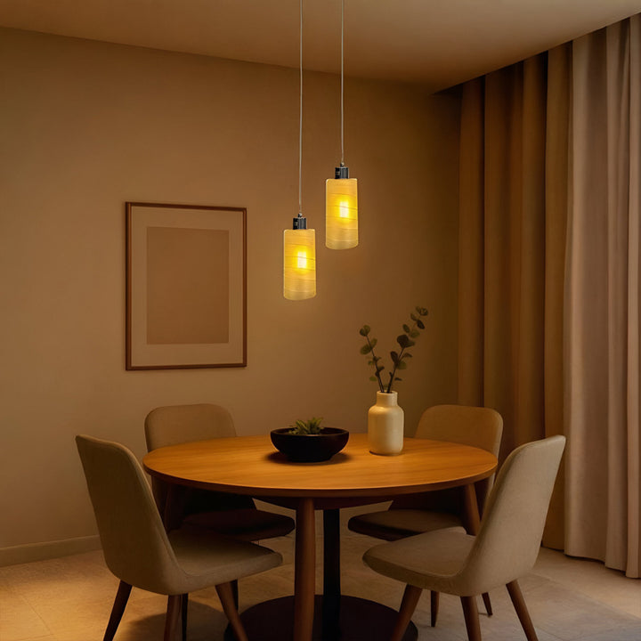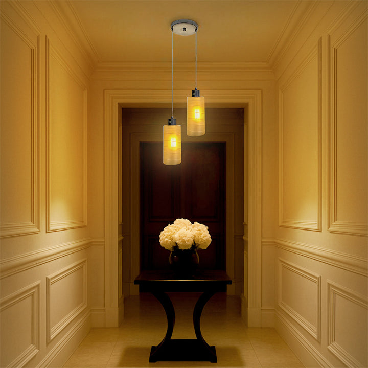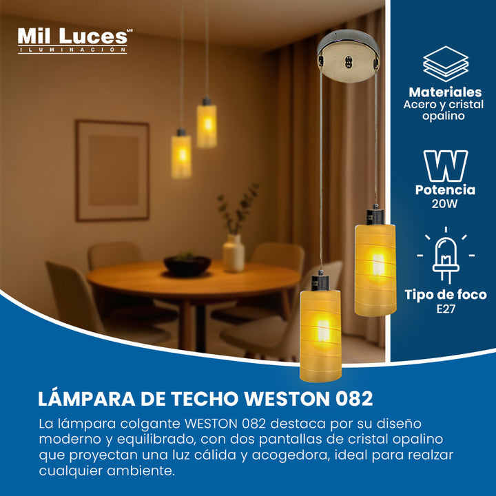 La lámpara colgante WESTON 082 ofrece un diseño moderno y equilibrado con dos pantallas de cristal opalino suspendidas sobre una estructura cromada. Su luz cálida y simétrica brinda una ambientación decorativa ideal para espacios amplios como barras, comedores o recibidores, combinando estilo con distribución uniforme de iluminación.