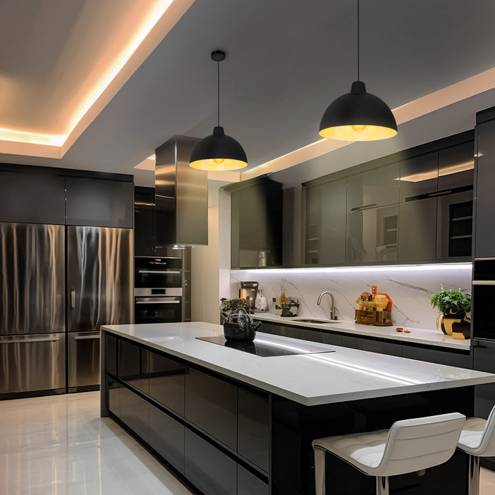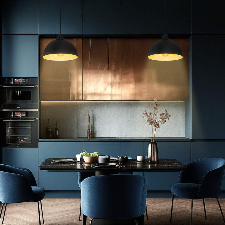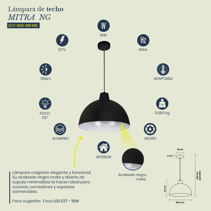 La lámpara colgante MITRA NG destaca por su diseño de cúpula minimalista en aluminio con acabado negro mate. Su estilo moderno aporta elegancia y sobriedad, ofreciendo compatibilidad con focos LED E27 para una iluminación funcional y versátil.