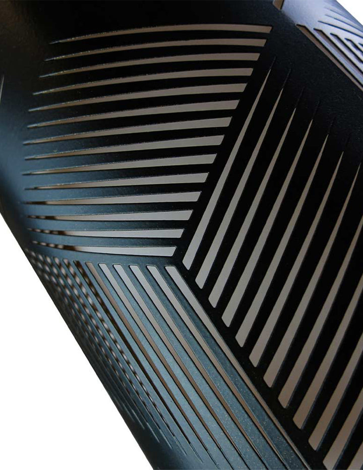 Fabricado con base de metal negro acabado mate, cuerpo de polipropileno negro acabado mate y pantalla de metal negro acabado mate.