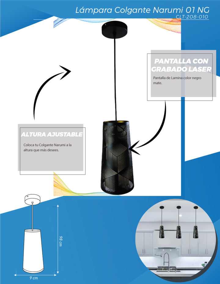 Lámpara colgante NARUMI 1L Negro, Las lámparas colgantes brindan una experiencia de amplitud y confort en lugares comerciales, hogar y hotelería, la sensación de una lámpara colgante es acogedora les da un estilo mucho más moderno o minimalista a las habitaciones.