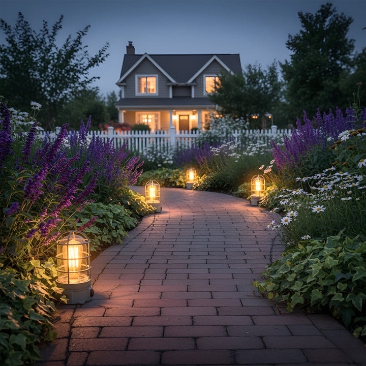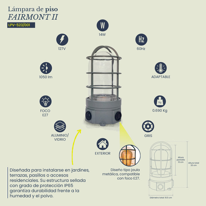 La lámpara de piso exterior FAIRMONT II combina resistencia y estilo industrial en una pieza funcional y decorativa. Fabricada en aluminio con pantalla de vidrio transparente, ofrece una iluminación cálida y directa que realza los espacios al aire libre. Su estructura tipo jaula protege el foco y aporta un toque robusto y elegante, ideal para jardines o accesos con diseño contemporáneo o vintage.