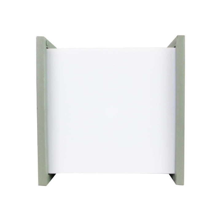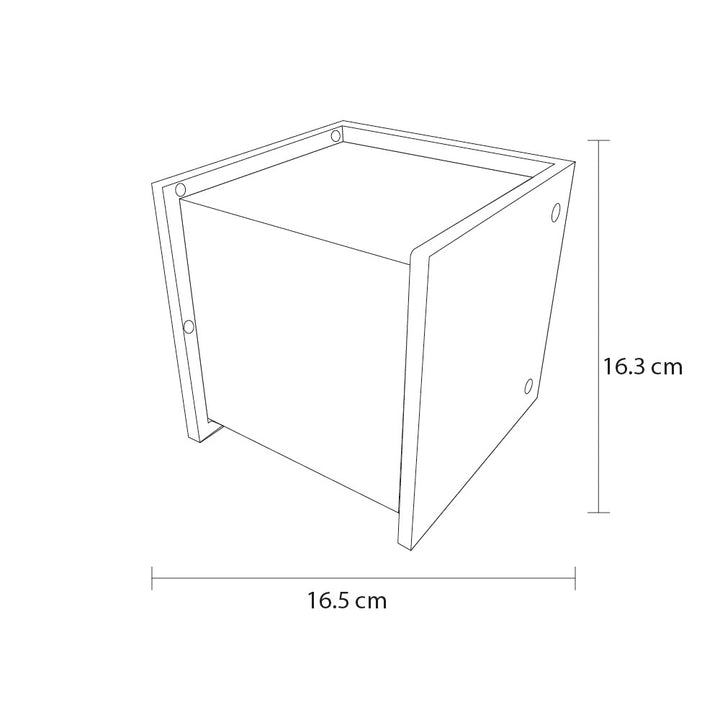 Fabricada con base y cuerpo de metal gris acabado mate y pantalla de polipropileno blanco acabado opalino. Dimensiones: 15 cm largo, 17 cm ancho, 15 cm de alto y 1.005 kg.