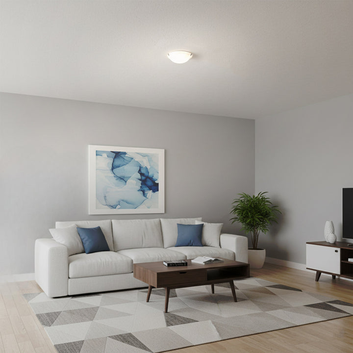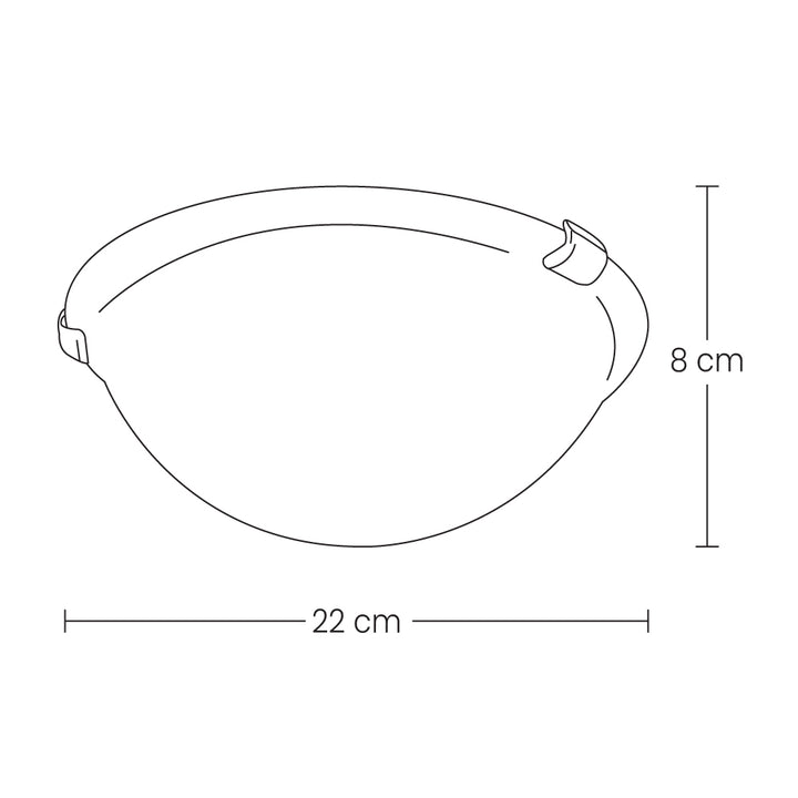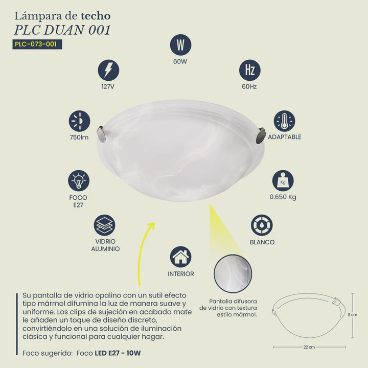 La lámpara de techo DUAN 001 combina un formato compacto (22 cm) con pantalla de vidrio opalino y clips metálicos que facilitan el montaje y el cambio de foco. Su difusor ofrece luz suave y homogénea, ideal para espacios pequeños que requieren iluminación discreta y elegante.
