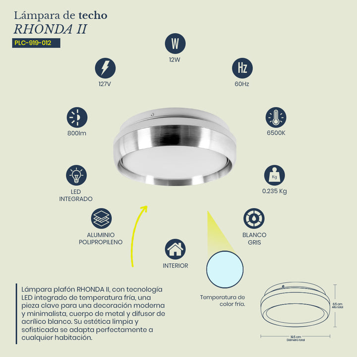 La lámpara plafón RHONDA II 12W combina tecnología LED integrada con un diseño moderno y minimalista. Su cuerpo de aluminio con difusor acrílico blanco ofrece una iluminación fría uniforme de 6500K, ideal para espacios que requieren luz clara y funcional sin deslumbramientos.