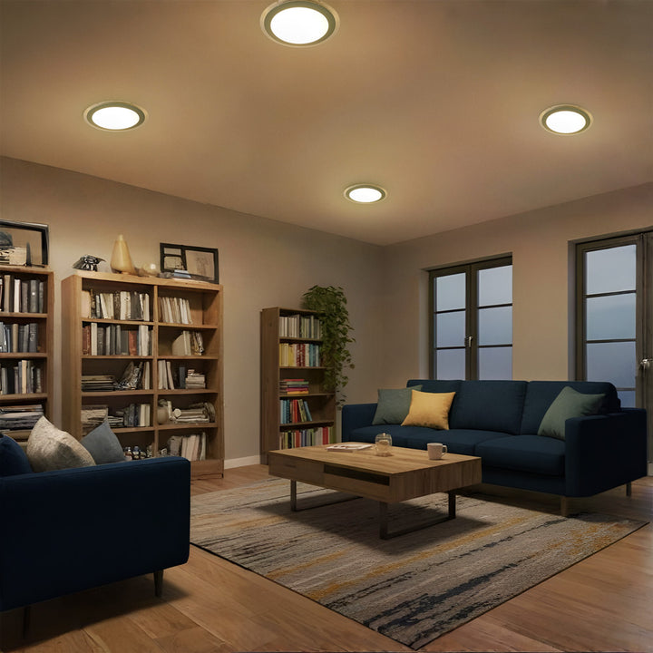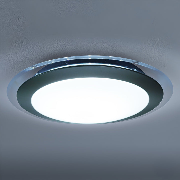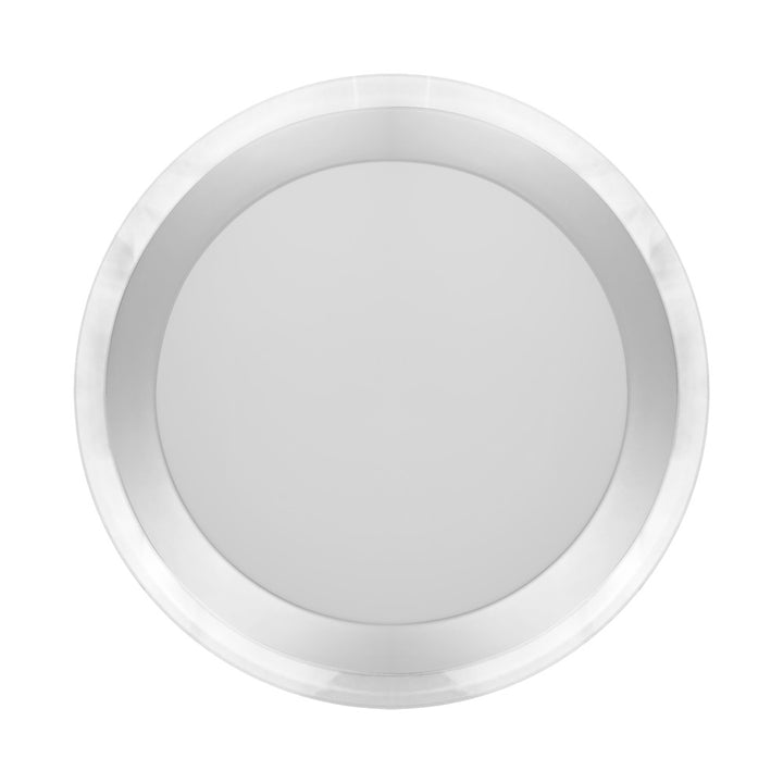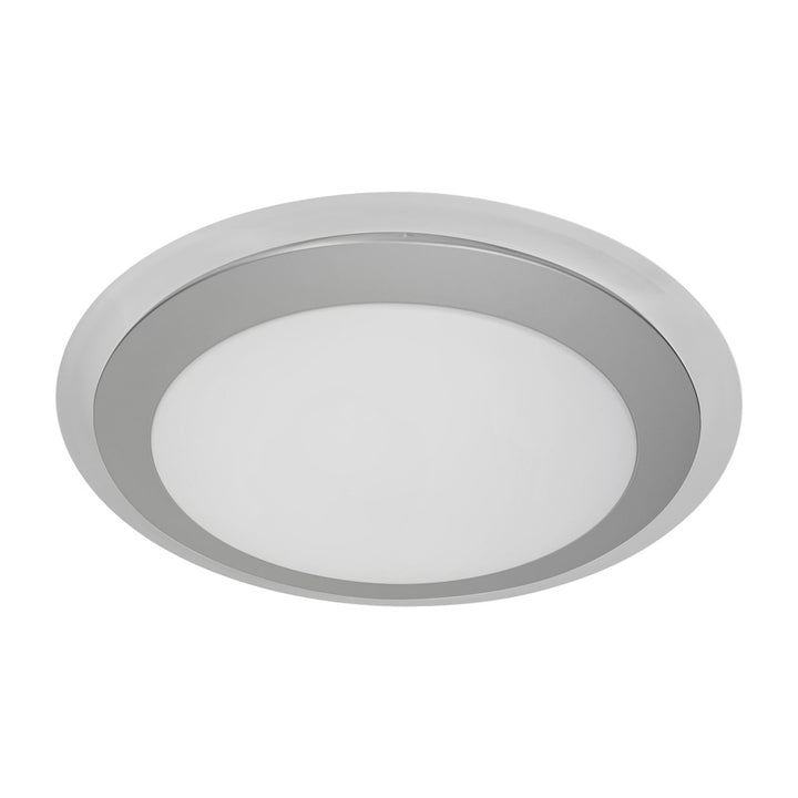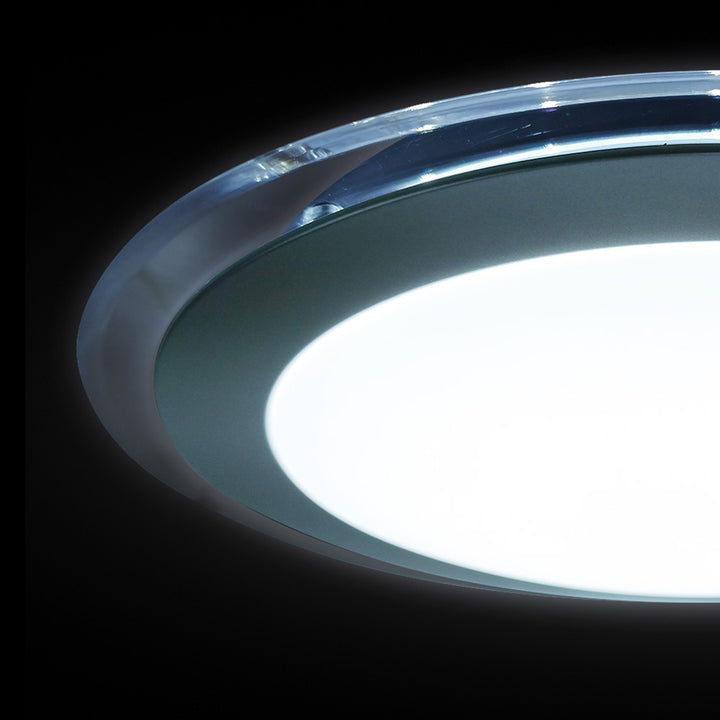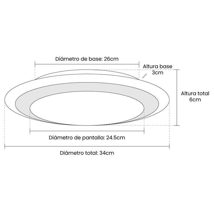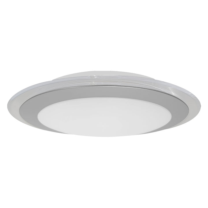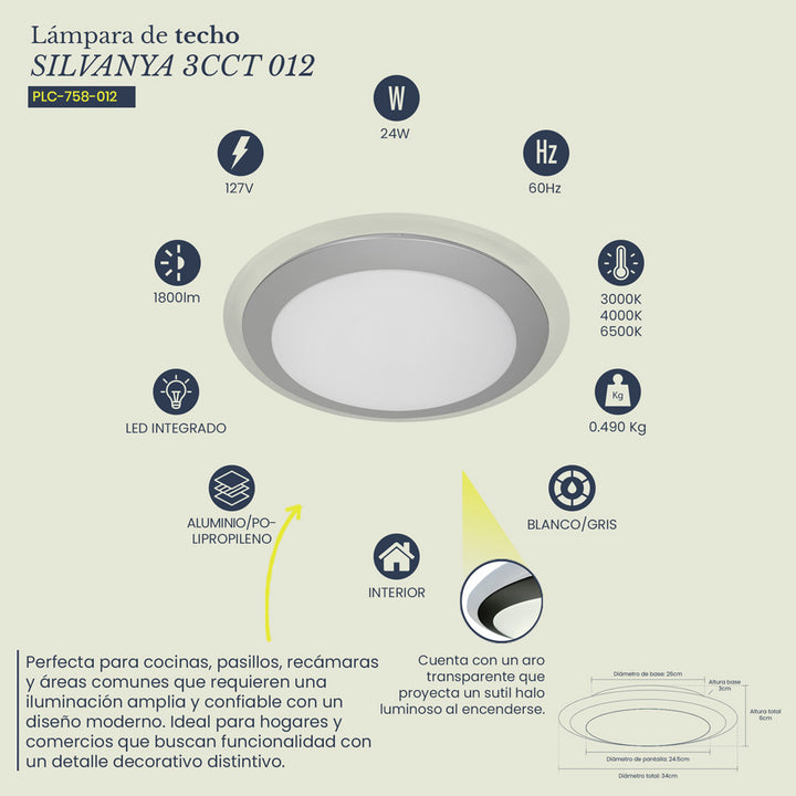 La lámpara de techo SILVANYA 3CCT 012 combina un acabado gris satinado con un aro transparente que proyecta un sutil halo luminoso. Con LED integrado de 24W y sistema CCT (3000K / 4000K / 6500K), ofrece iluminación uniforme y adaptable en un formato de 34 cm de diámetro.