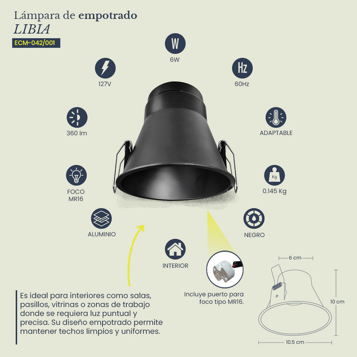 La lámpara empotrada LIBIA combina un diseño minimalista con un cuerpo de aluminio en acabado negro mate que garantiza resistencia y durabilidad. Su estética discreta permite integrarla fácilmente en techos modernos, aportando iluminación puntual sin alterar la armonía del espacio.