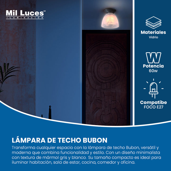 Transforma cualquier espacio con la lámpara de techo BUBON, una pieza versátil y moderna que equilibra funcionalidad y diseño. Su estructura compacta con pantalla de vidrio marmoleado y base en gris mate encaja perfectamente en interiores contemporáneos, aportando textura visual sin perder sencillez. Compatible con foco E27, es una opción eficiente y adaptable para iluminar múltiples tipos de espacios.