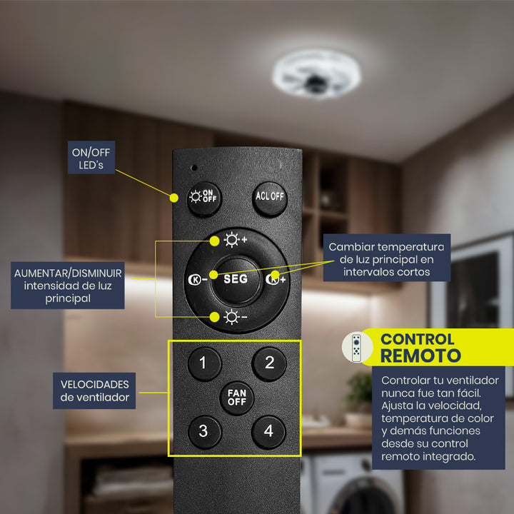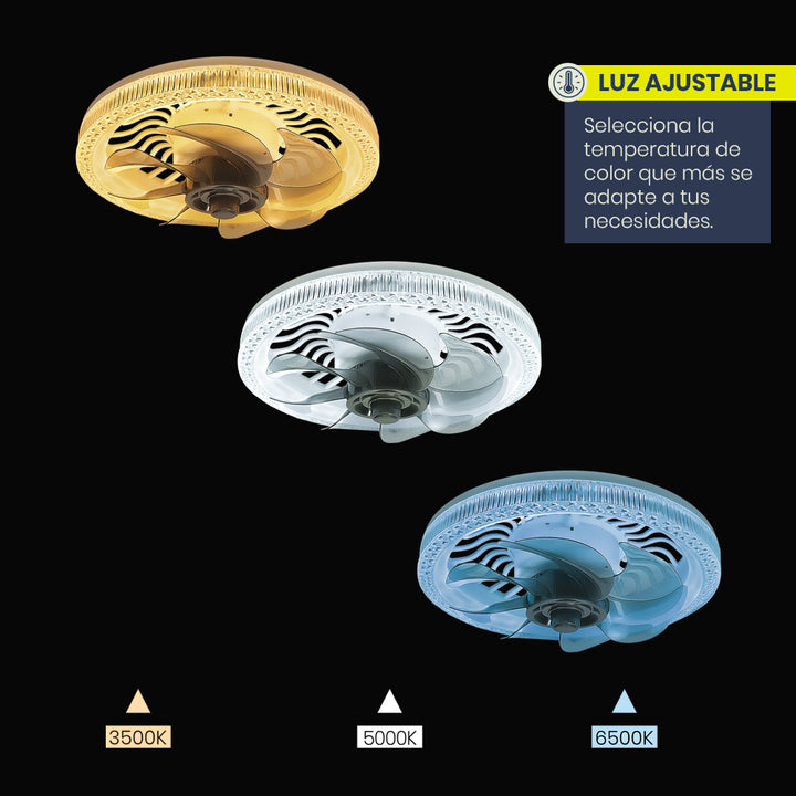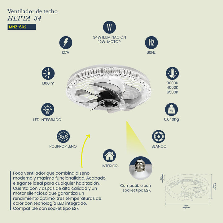 El foco ventilador HEPTA 034 combina ventilación e iluminación inteligente en un diseño compacto y funcional. Gracias a su base E27, se instala igual que un foco convencional, sin necesidad de obras ni cableados adicionales. Cuenta con luz LED integrada de tres temperaturas (cálida, neutra y fría) y aspas retráctiles que ofrecen un flujo de aire eficiente y silencioso.