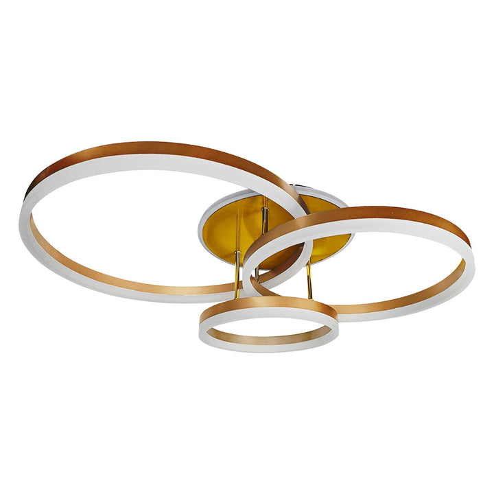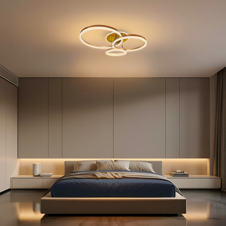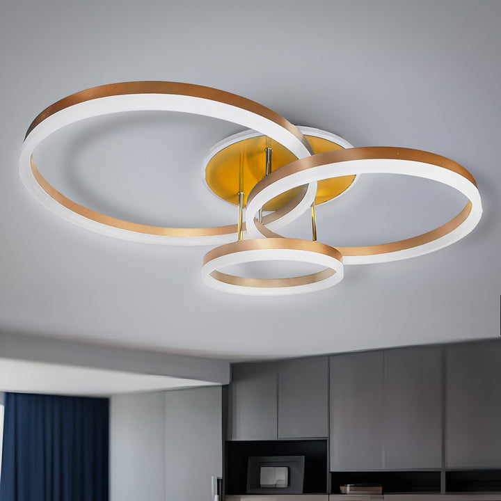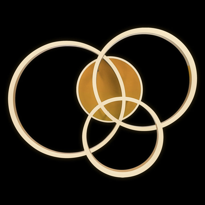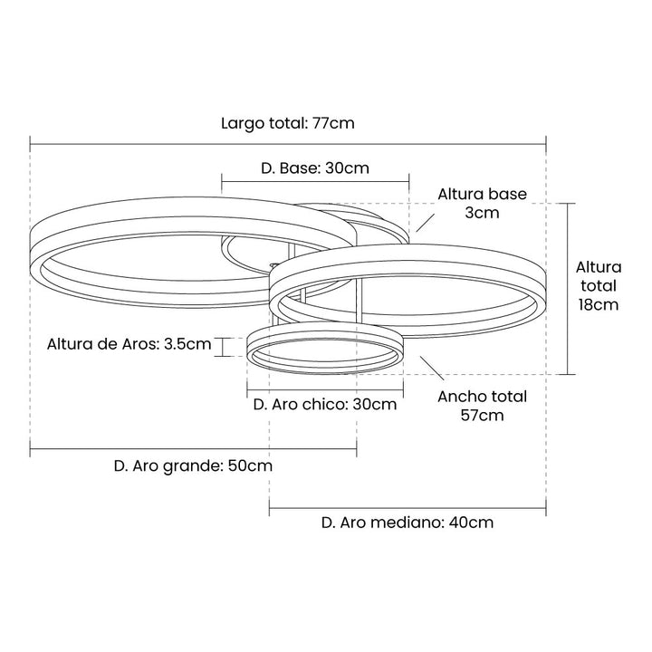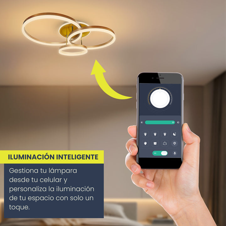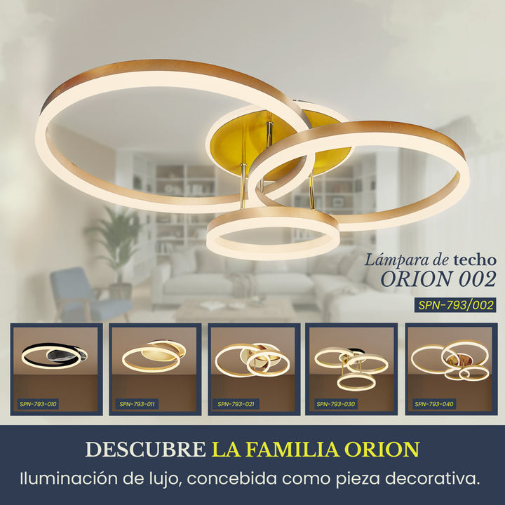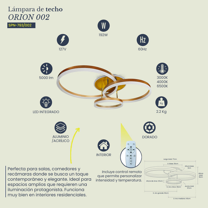 El semiplafón Orion 002 integra tres aros iluminados en un diseño moderno fabricado en aluminio con difusores acrílicos, ofreciendo una iluminación uniforme y decorativa. Con 192W LED integrados, permite ajustar tanto la intensidad como la temperatura de color mediante control remoto, app móvil y su compatibilidad con asistentes inteligentes como Alexa y Google.