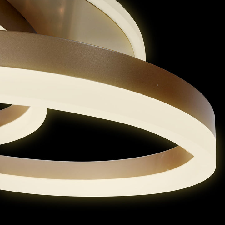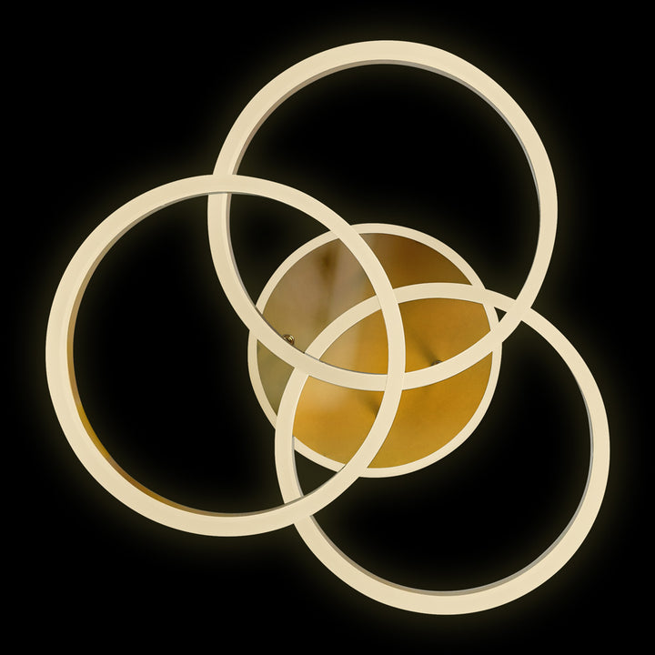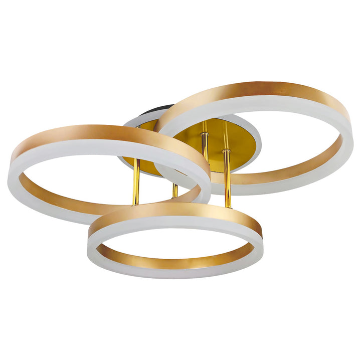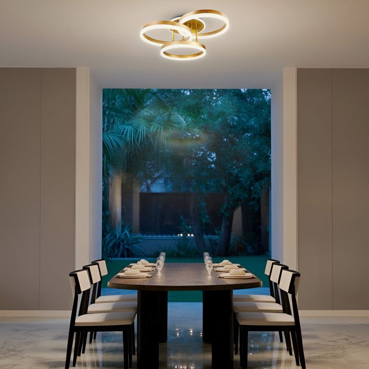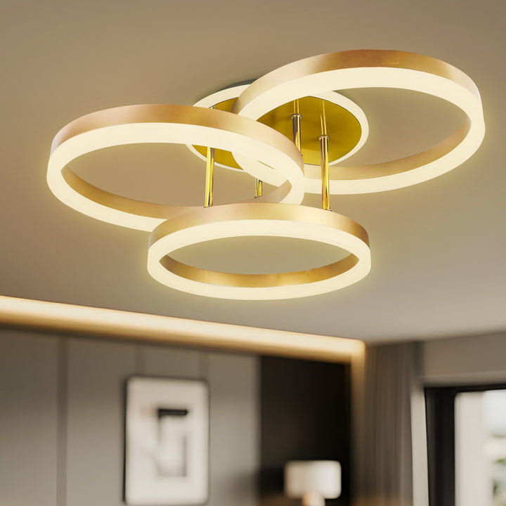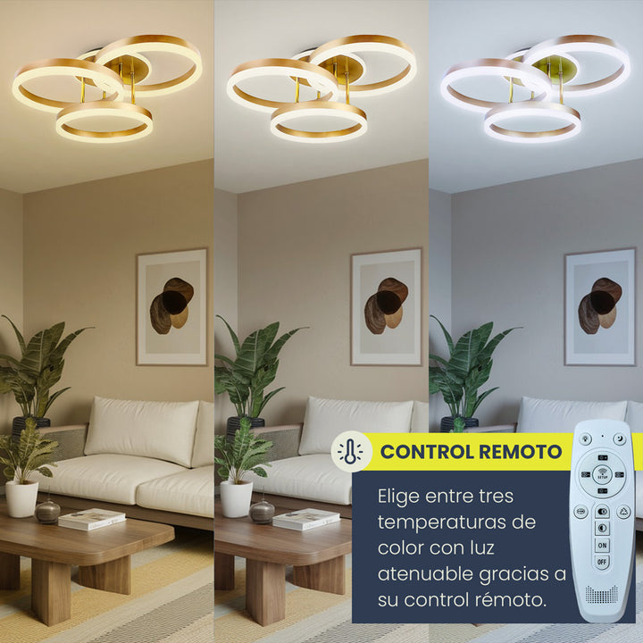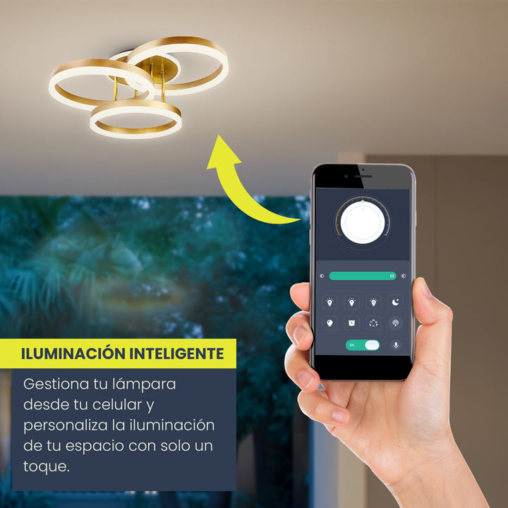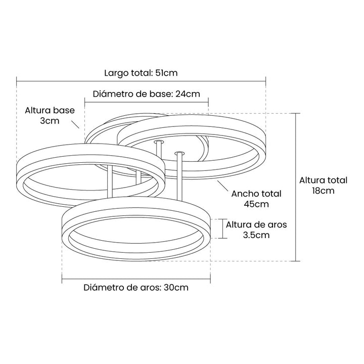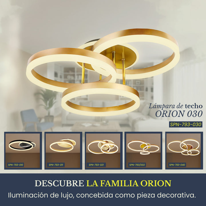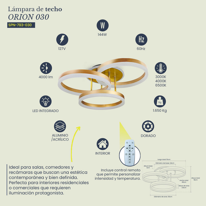 El semiplafón Orion 030 presenta un diseño armónico compuesto por tres aros del mismo tamaño, logrando una estética equilibrada y moderna. Fabricado en aluminio con difusores acrílicos, ofrece iluminación uniforme y envolvente mediante sus 144W LED integrados, con ajuste de intensidad y temperatura de color desde control remoto, app móvil y su compatibilidad con asistentes inteligentes como Alexa y Google.