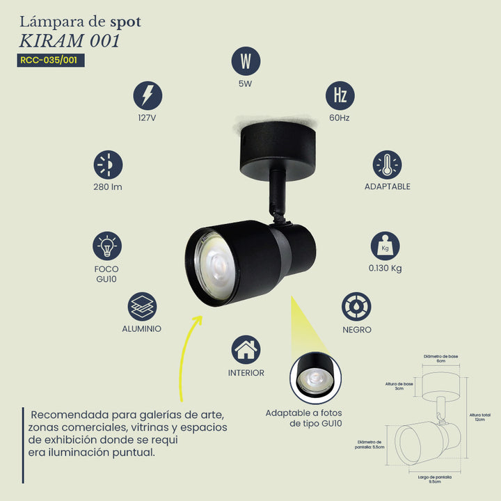 La lámpara de spot Kiram 001 está fabricada en aluminio con acabado negro mate y diseño compacto. Su cabezal orientable permite una iluminación precisa y versátil, ideal para destacar elementos o generar acentos de luz en interiores modernos.