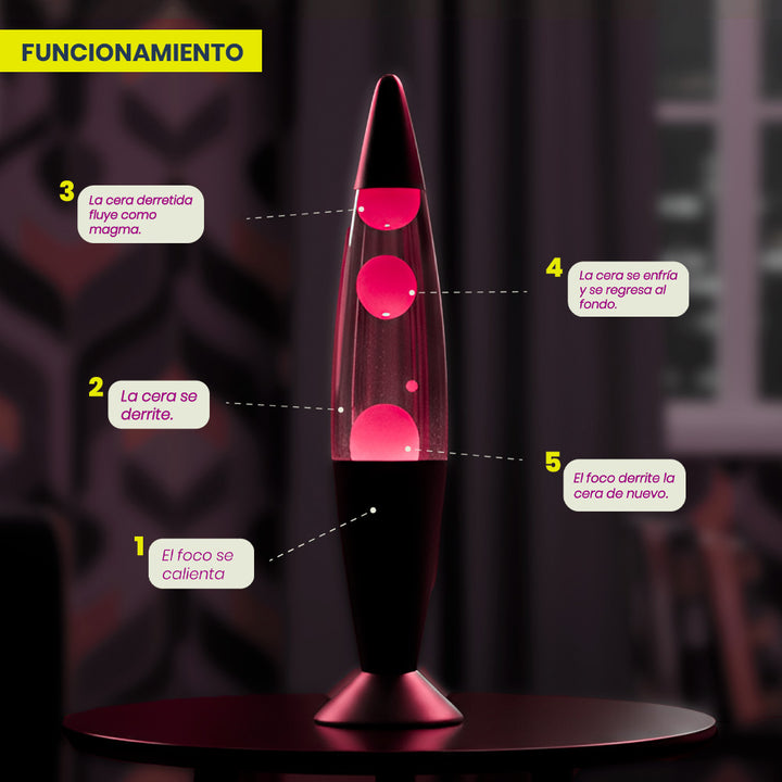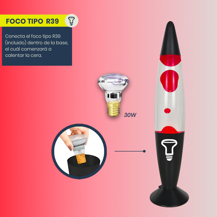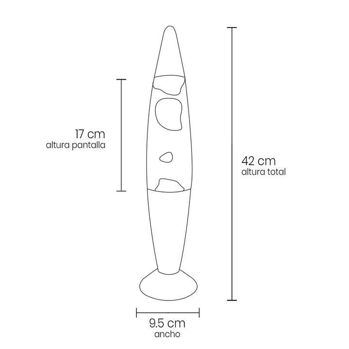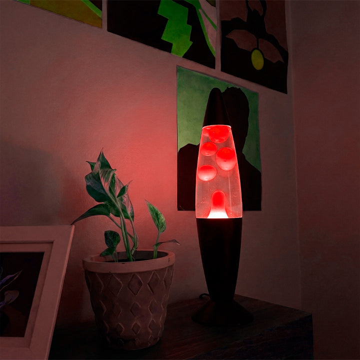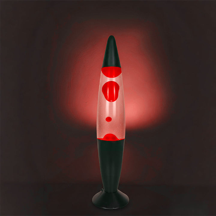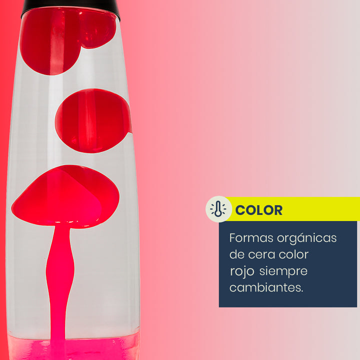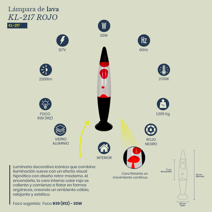 La lámpara de lava KL-217 en color rojo combina un cuerpo de vidrio transparente con cera roja vibrante y detalles metálicos en acabado satinado. Su diseño retro con estética contemporánea crea un efecto visual hipnótico y cálido, ideal para destacar cualquier espacio con personalidad.