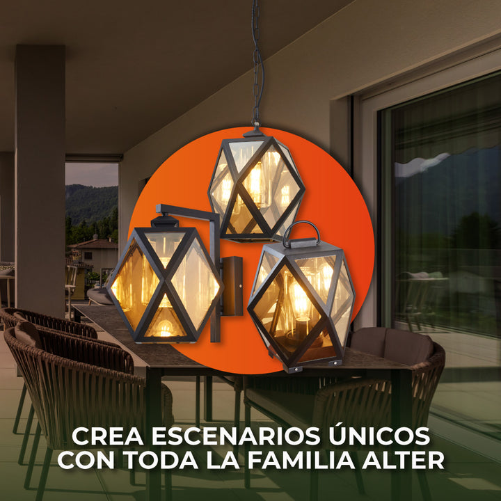 La lámpara de pared ALTER III ofrece un balance entre estilo geométrico y funcionalidad práctica para exteriores. Su pantalla de cristal ámbar proyecta una luz cálida y envolvente, mientras su estructura resistente garantiza durabilidad frente al polvo, salpicaduras de agua e impactos. Con base E27, brinda la libertad de elegir el foco ideal para personalizar tu iluminación exterior con un toque moderno y elegante.