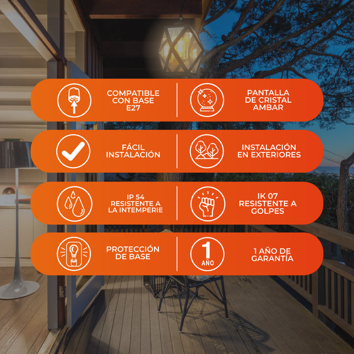 La lámpara de piso ALTER I combina diseño geométrico y funcionalidad para iluminar exteriores con estilo. Su pantalla de cristal ámbar aporta un efecto cálido y acogedor, mientras que su estructura resistente con protecciones IP54 e IK07 asegura durabilidad frente a polvo, agua e impactos. Con base E27, permite elegir el foco que mejor se adapte a tus necesidades, ofreciendo versatilidad para crear ambientes únicos en exteriores.