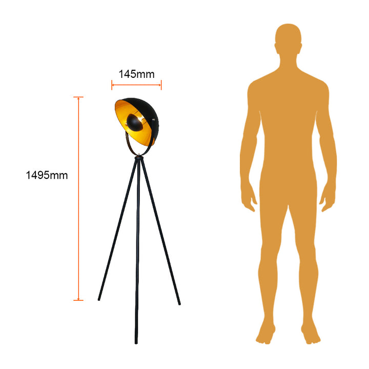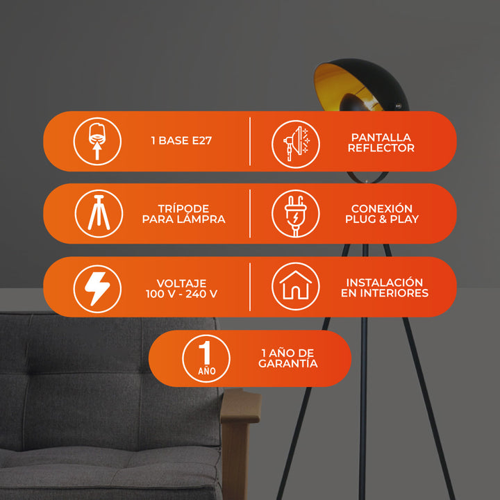 La lámpara de pie CHECHIA combina un diseño industrial moderno con un estilo minimalista gracias a su base de trípode y carcasa de acero. Su terminado en negro y dorado crea un llamativo contraste visual. Utiliza distribución de luz E27 para un foco que dirige una luz focalizada, ideal para añadir acento y estilo en cualquier rincón.