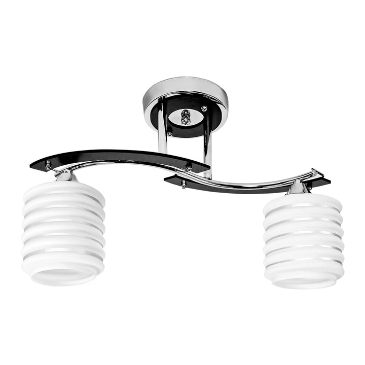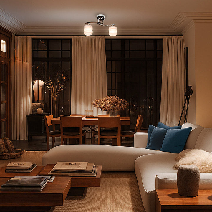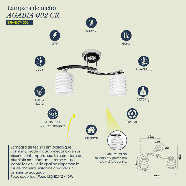 La lámpara de techo semiplafón AGABIA 002 destaca por su diseño contemporáneo que combina aluminio en acabado cromo brillante con pantallas de vidrio opalino. Su estilo elegante permite difundir la luz de forma uniforme, aportando un ambiente cálido y sofisticado en cualquier espacio interior.